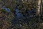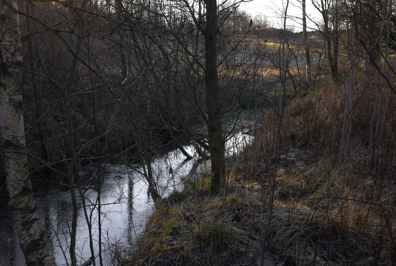 vägen vi svängde in på vid Falekvarna . Bäcken från hästhagskällan förenar sig med den från Orreholmen kommande bäcken nere i dalen. Här finne en övergång