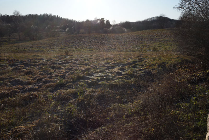 leden som gick mot Falköpingshållet. Som framgår av kartan skissar vi på att leden från Hästakällan och Långåsen grenar sig och de som skulle västerut valde kanske denna led som rundar kullen på nedsidan ungefär där nuvarande vägar går, på några 100 m är vägen bortodlad men i stora drag följde nog leden nuvarande väg. Mer uppgifter. Färdväg genom dalen. Genom en djup ravin som påminner om en rejäl hålväg. Kulle med brunn och borglämning |