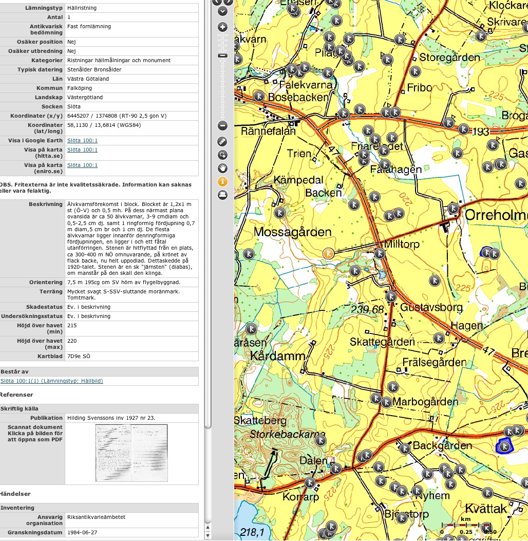 alldeles ovan Kårdam på kartan nedan. Jag hittade skålgropar på en något mindre sten 50 m s om den stora välkända stenen denna mindre finns i bild och är inte med i fornminnesregistret, riktigt kul. Älvkvarnar är omskrivna ute på webben, de har fram till 1920 talet används i olika riter. man malde säd i skålgroparna för att blidka makterna för att få bättre skörd. De smordes in med talg i olika syften ofta för att bota sjukdomar. Ordet älvkvarnar lär komma från älvor, och deras påverkan på folk, sjukdomar, skörden m.m. Det som slår mig är att skålgroparna åtminstone här är placerade där daggen och dimmorna kommer först när vädret ger förutsättningar, invid vattendrag och längst ned i dalen, där man i dimman kan förvänta sig att älvorna ska uppenbara sig. |