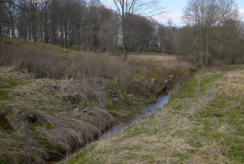I bakgrunden Vartofta gård dit mellersta källflödet går, källflödet böjer av och rinner bakom gården. En karta från