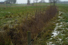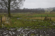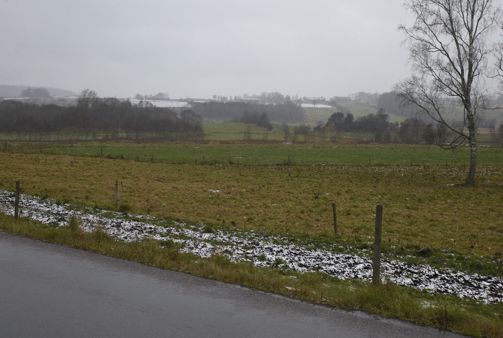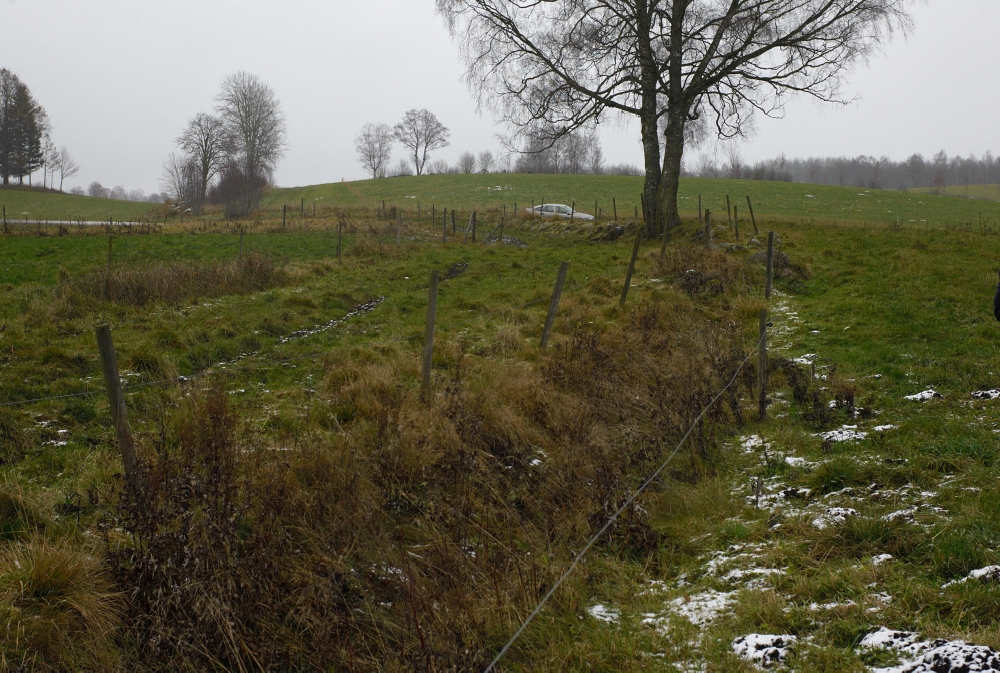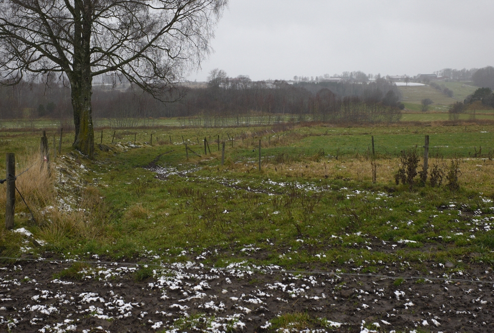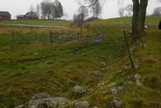 | Längst ned i dalen strax norr om nuvarande Falköpingsvägen finns denna gamla väg som enligt fornminnessök ingått i Eriksgatan under medeltiden. Området är så pass utdikat att det inte är lätt att säga vad som varit, bilderna säger sitt och det är inte omöjligt att det är en gammal väg. Kvarnbäcken rinner alldeles bakom fotografen. man ser i vägen en massa småstenar i dagen som tyder på att en gammal väg gått här. Vid trädet är det en rejäl stenkant som ser ålderdomlig ut och stöder tanken på gammal väg som kommit från kullarna i bakgrunden alltså från Pinnekavadet. De valde att först passera Kvarnbäcken och därefter den minde bäcken från Vartoftadalen, smart kanske om man förutsätter att den mindre bäcken var lätt vadbar. | |