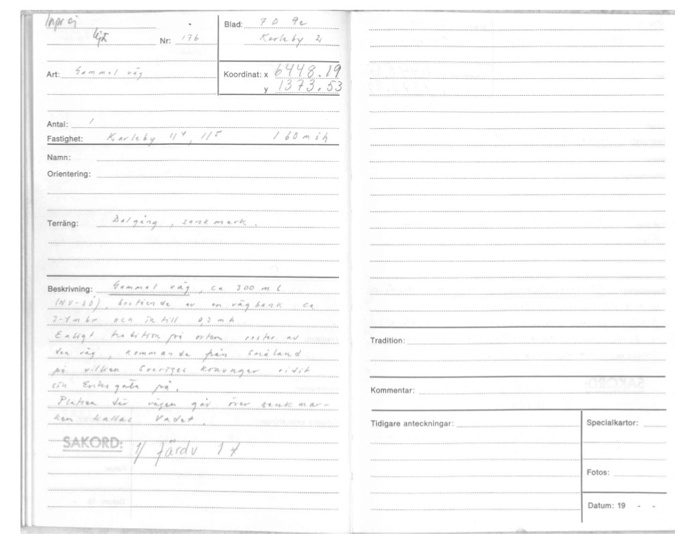 Riksantikvarieämbetet fornsök. Gammal väg, ca 300 m l (NV-SÖ), bestående av en vägbank ca 3-4 mbr och intill 0,3 m h.se, gammalt vad dok . Enligt tradition på orten rester av den väg, kommande från Småland på vilken Sveriges konungar ridit sin Eriksgata på. Platsen där vägen går över sankmarken kallas Vadet. Hur vägen fortsatte uppför sluttningen mot Karleby är höljt i dunkel, jag fick se avtryck i marken på kartan inom den markerade delen, leden gick direkt på Karleby kyrka, om det är korrekt eller inte skulle vara roligt att veta, ska kollas upp när väder och tid medger. |